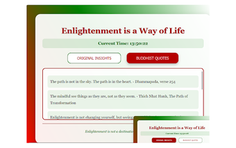 Den färgglada designen, med en röd-grön-vit gradient och en realtidsklocka, skapar en inbjudande atmosfär för användaren. Citat visas i ett scrollbart område, och en fast fras påminner om att "Enlightenment is not a destination, but a way of life." Denna extension är idealisk för dem som söker en enklare väg till mindfulness och personlig tillväxt, och erbjuder offline-stöd via Chrome-lagring.